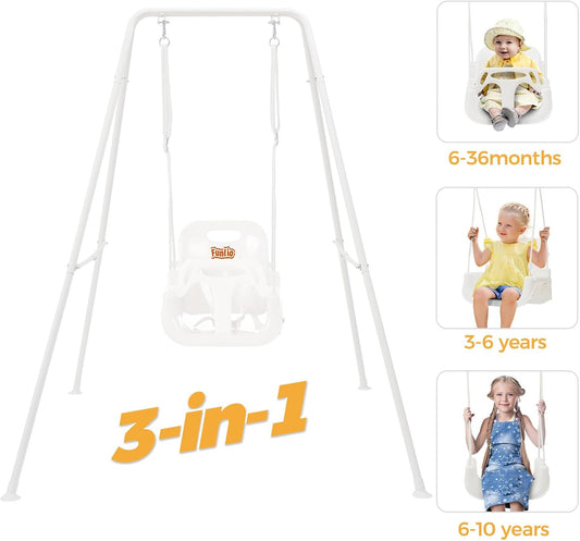 FUNLIO 3-in-1 Toddler Swing Set with 4 Sandbags, Indoor/Outdoor Baby Swing with Foldable Metal Stand, Kids Swing Set for Backyard, Clear Instructions, Easy to Assemble & Store, White